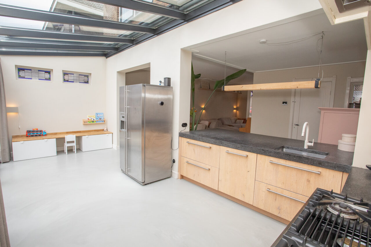 Grote open woonkamer v.v. een nieuwe vloer en vloerverwarming, erker aan de voorzijde. Achterste deel van de woonkamer heeft een eetkamer en open keuken met veel ramen die een lichte serre creëren, schuifdeuren naar het terras. De serre is v.v. elektrisch bedienbare zonwering. Het luxe Boretti-fornuis, nieuwe afzuigkap en koel/ vriescombinatie maken het geheel compleet. Vloerverwarming in de woonkamer, keuken en serre. De bijkeuken beschikt over witgoedaansluitingen. Vaste trap naar de zeer ruime kelder. Tuin bereikbaar via de serre, bijkeuken en buitenom door de poort naast het huis.