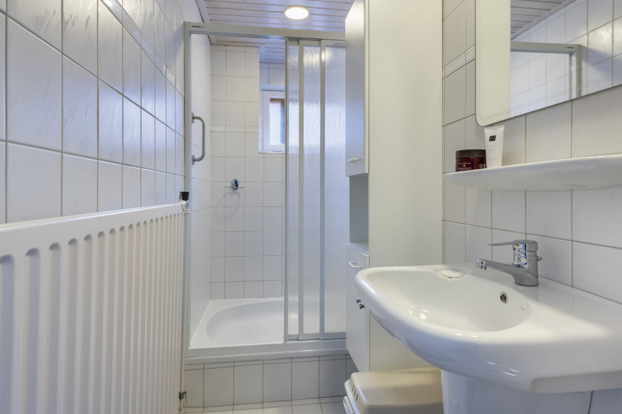 1e verdieping: overloop met vier fijne slaapkamers en een keurige badkamer voorzien van een wastafel en douche.