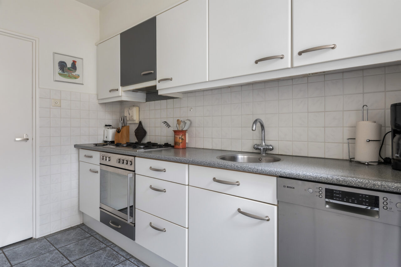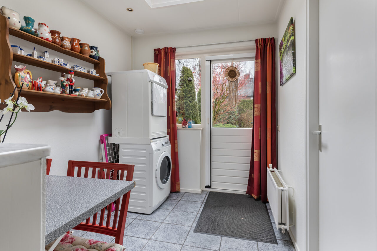 afzuigkap, oven, vaatwasser en proviandkast. Achter de keuken bevindt zich een doorgang naar de bijkeuken met aansluitingen voor witgoed. Via de bijkeuken bereikt u de ruime woonkamer, die beschikt over een schuifpui, open haard en parketvloer.