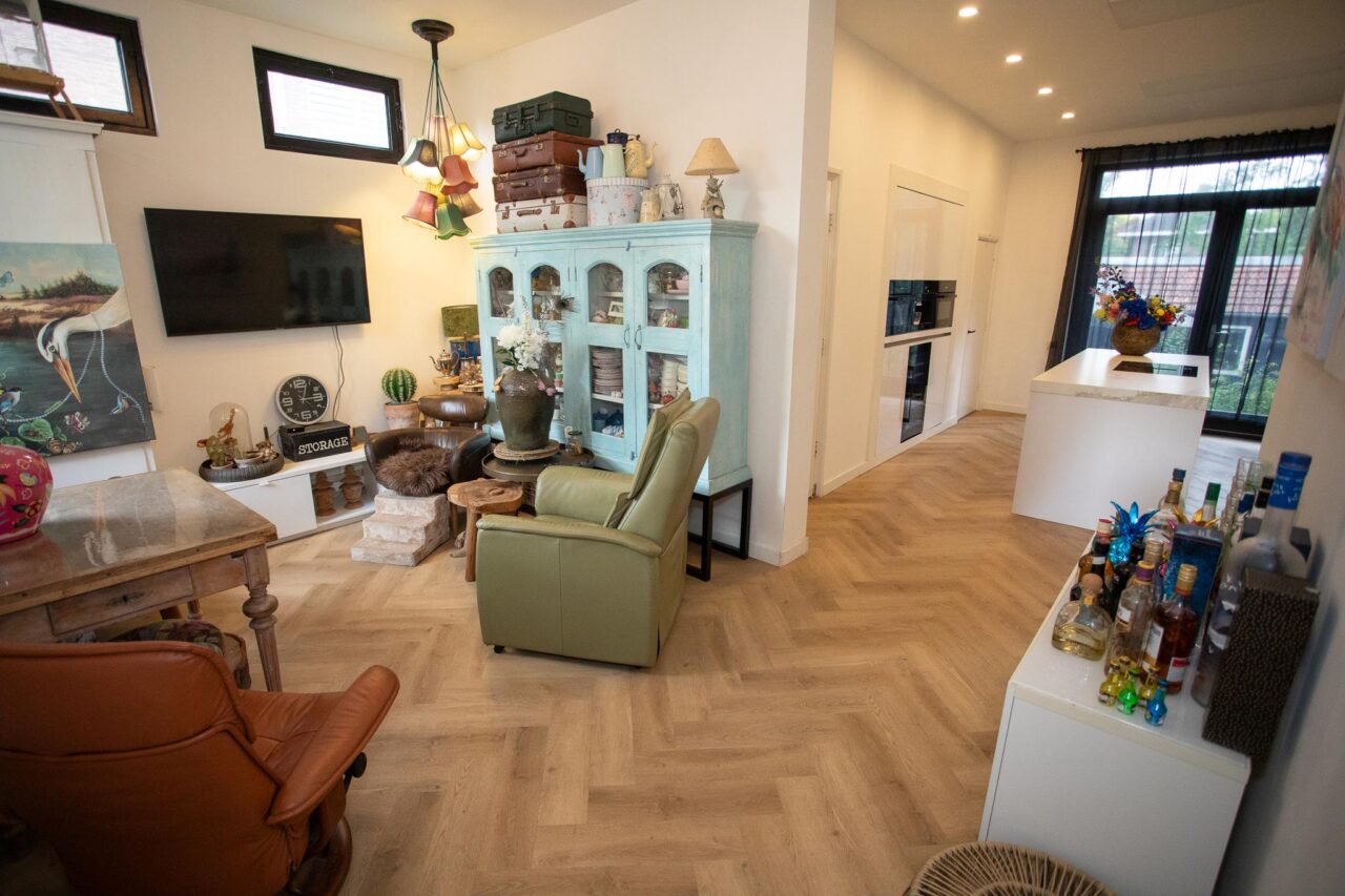 Begane grond: hal met fraaie bordestrap en pvc visgraat vloer (deze vloer is zwevend en daardoor makkelijk te verwijderen zodat de marmeren vloer tevoorschijn komt). Doorgang naar de eerste keuken (2018) aan de voorzijde en zeer luxe en riante woonkeuken met kookeiland. Toilet, bijkeuken en toegang tot de slaap-/werkkamer. De woon(voor) kamer heeft een houtkachel, 2 vaste kasten en erker. De serre wordt verwarmd doormiddel van een infrarood paneel aan het plafond en heeft schuifdeuren naar het terras. De achter-/eetkamer is voorzien van een extra toiletruimte en toegang naar een ruime voorraad/wijn kelder.