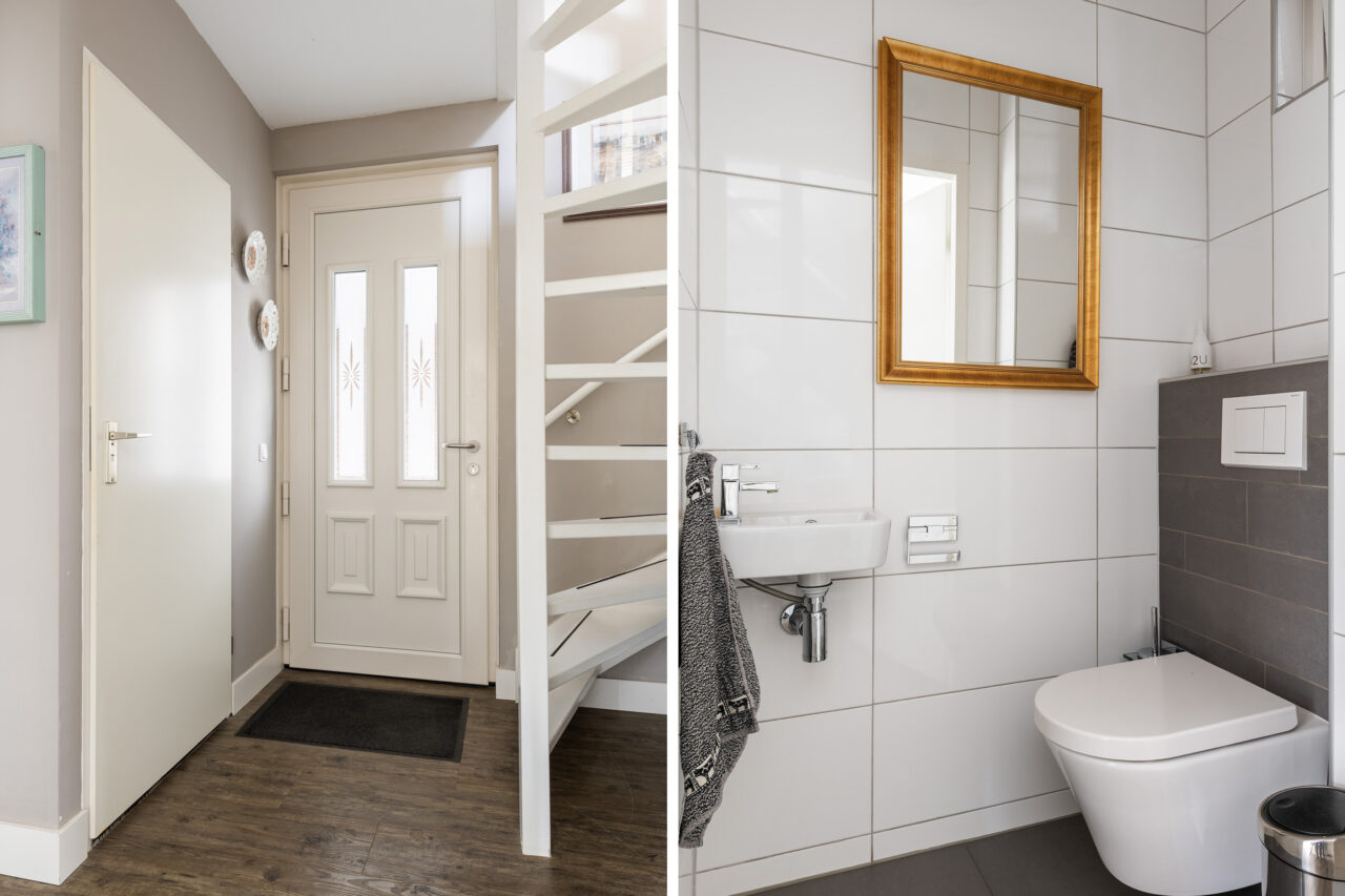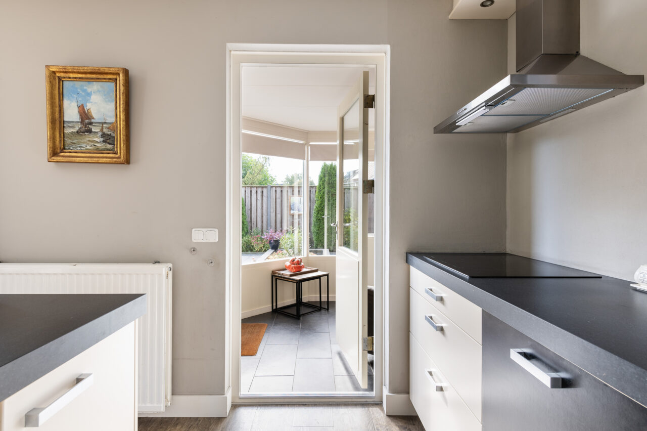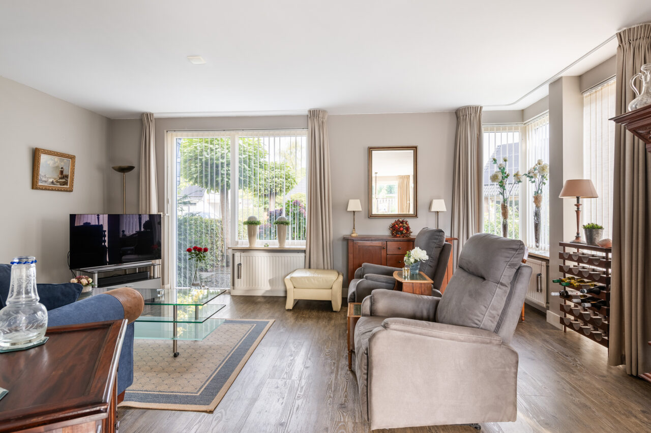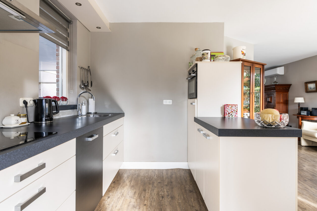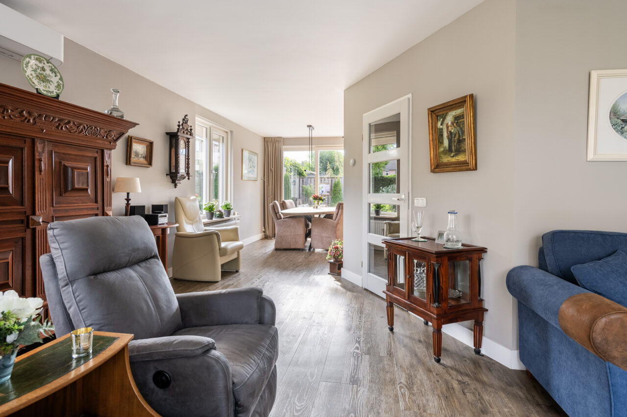 Begane grond: entree met een ruime hal, inclusief meterkast en garderobe. Modern toilet met fontein. Royale L-vormige woonkamer, uitgerust met airconditioning en schuifpui v.v. veiligheidsglas. De moderne halfopen keuken (aangepast in 2018) beschikt over een werkblad en inductiekookplaat. De koelkast, inbouwvaatwasser, combimagnetron en afzuigkap zijn vernieuwd in 2021. Vanuit de keuken is er toegang tot de bijkeuken, die directe doorgang biedt naar de geïsoleerde aangebouwde garage.