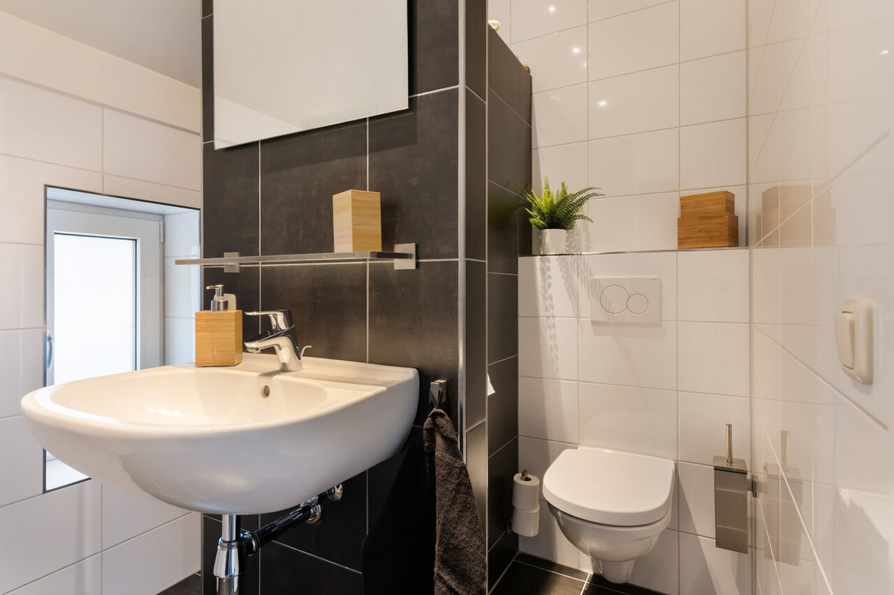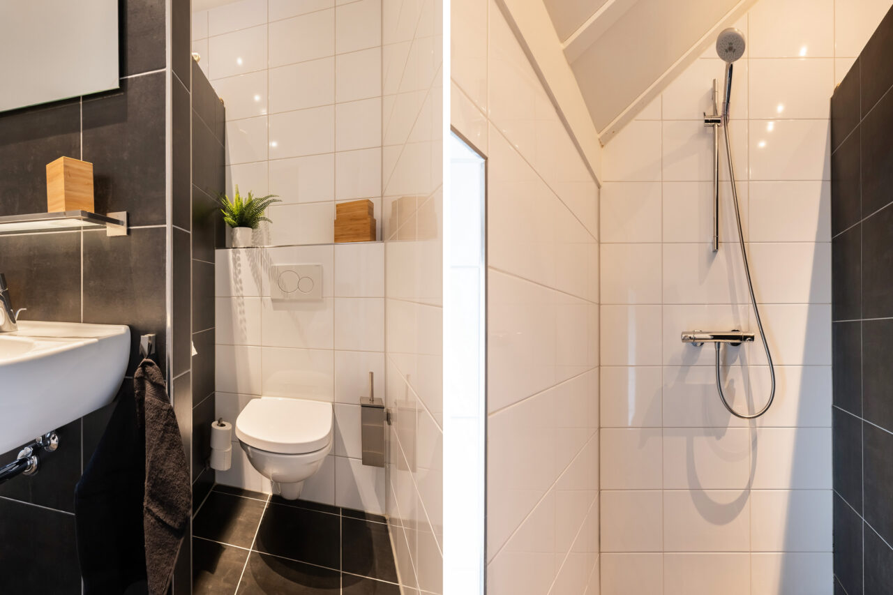 Eerste verdieping: overloop, drie slaapkamers en een badkamer voorzien van een wastafel, douche, (hang)toilet en designradiator.