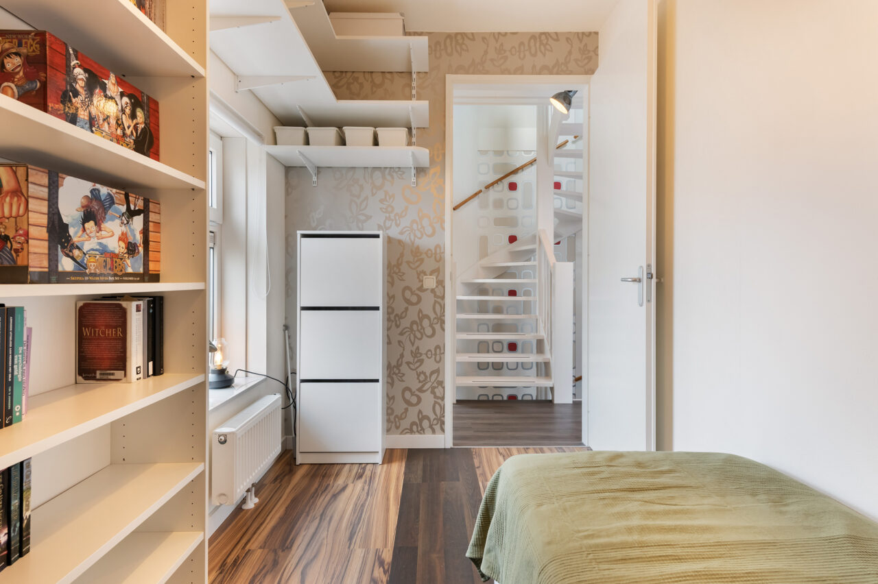 Tweede verdieping: vaste trap, overloop met ruimte voor de witgoedaansluitingen en cv-ketel, en een vierde slaapkamer/hobbykamer.