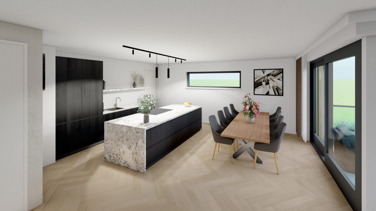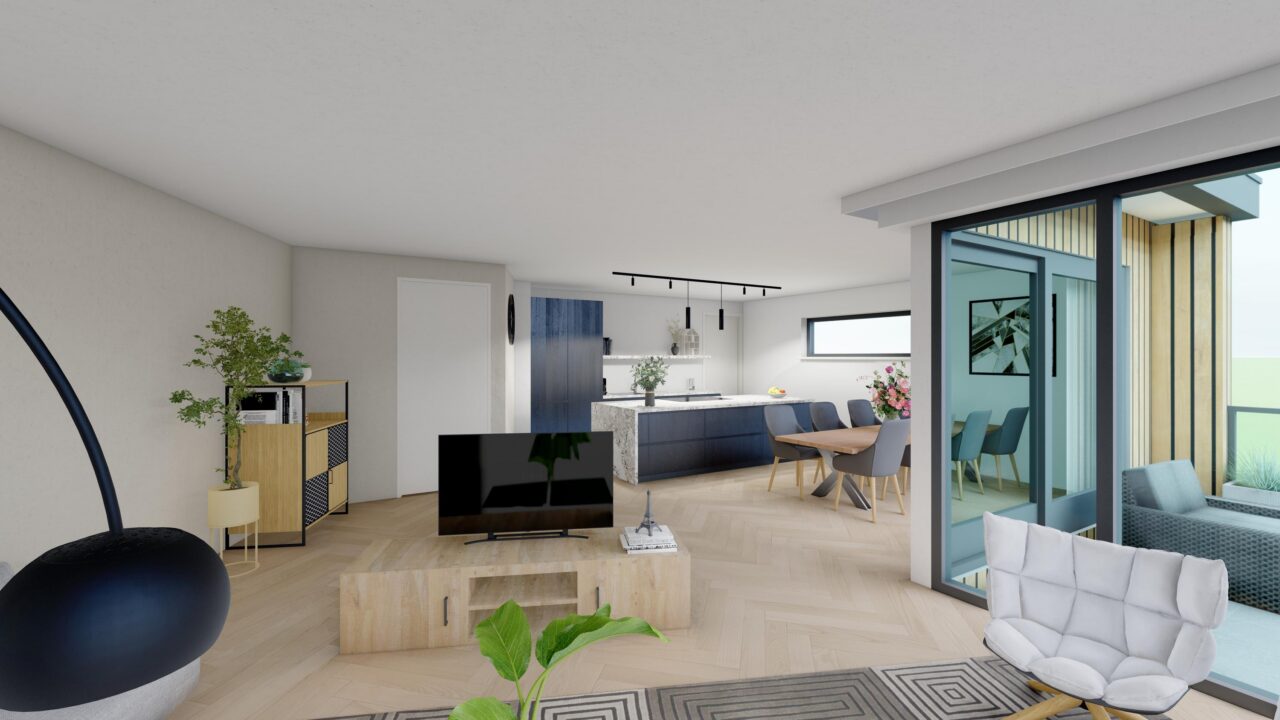 De royale woonkamer met open keuken vormt het hart van de woning. Deze lichte leefruimte straalt modern comfort uit en is perfect voor gezellige avonden, diners of ontspannen momenten met familie en vrienden. De open keuken sluit naadloos aan op de woonkamer en is praktisch én stijlvol ingericht.