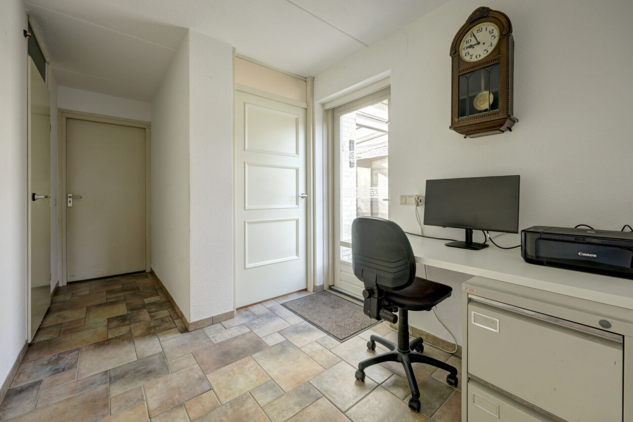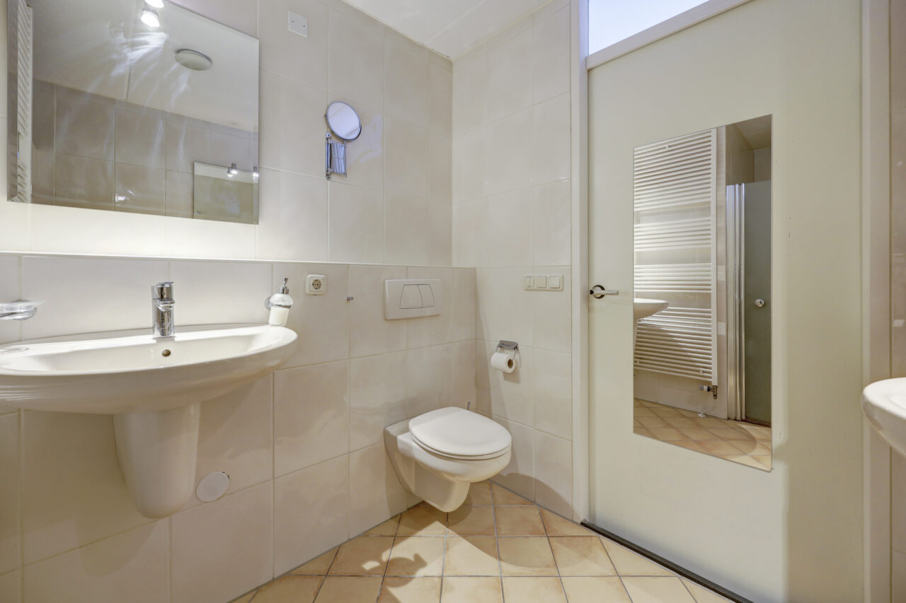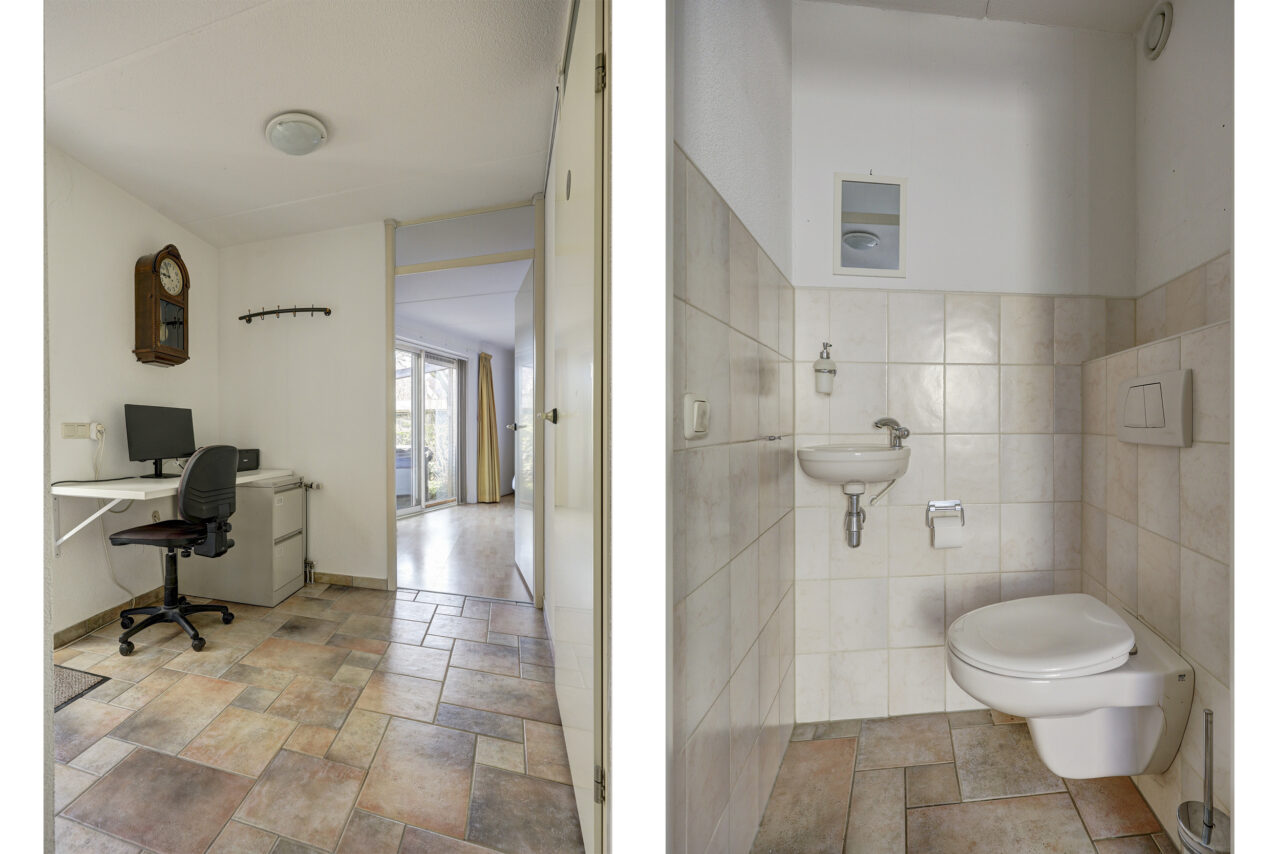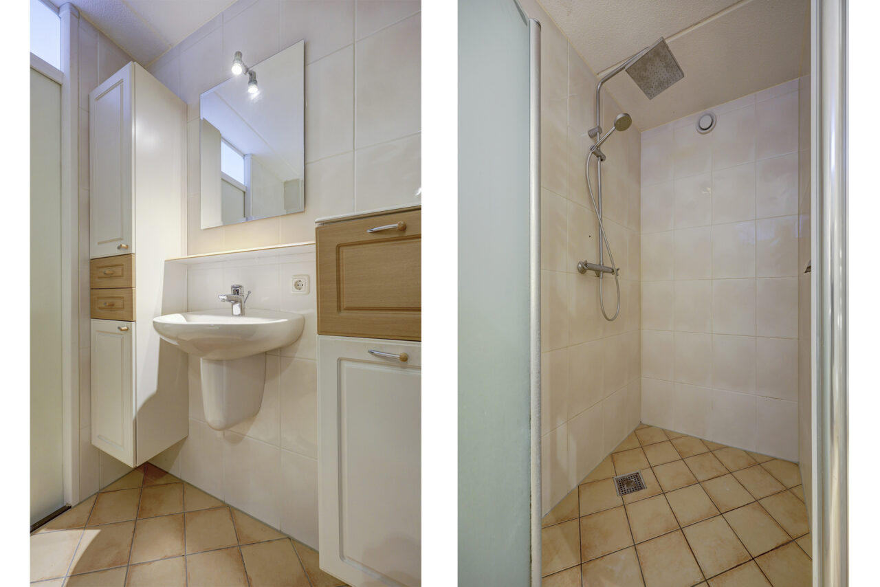 Vanuit de woonkamer is er toegang tot een tussenhal die toegang geeft tot de toiletruimte, bijkeuken met cv-installatie en witgoedaansluitingen en garage. Via de hal is er eveneens toegang tot de ruime slaapkamer die voorzien is van een schuifpui en badkamer die is uitgerust met een dubbele wastafel, toilet en douchehoek.