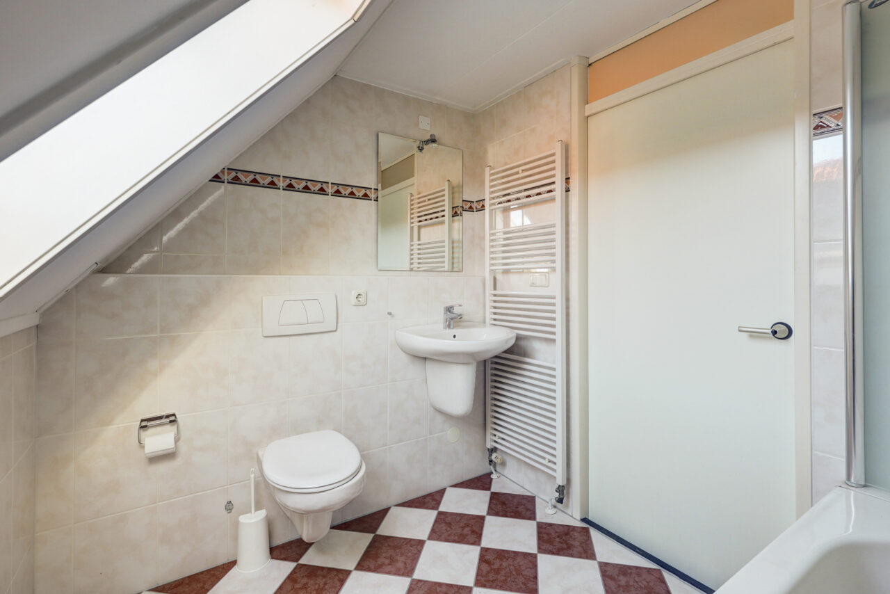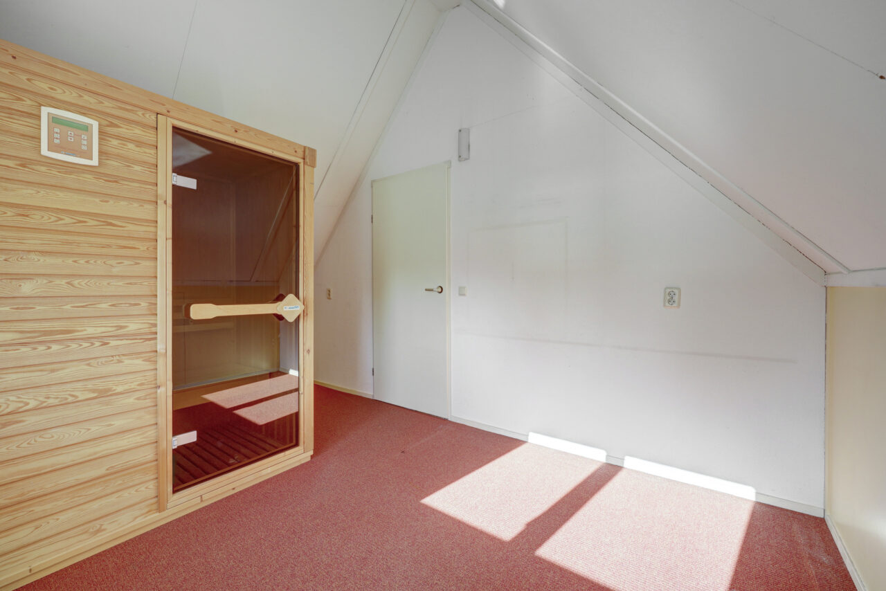 Eerste verdieping; Overloop met 2 slaapkamers en 2e badkamer met wastafel, ligbad met douche en toilet. 1 slaapkamer is uitgerust met een sauna. Daarnaast is er vanaf de overloop toegang tot een kleine bergzolder.