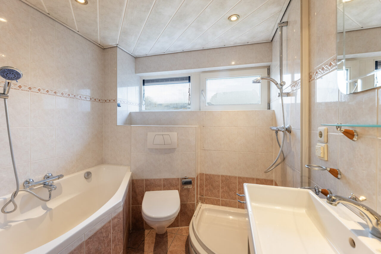 Eerste verdieping: overloop met vaste kast, twee grote slaapkamers met elk drie vaste kasten, een derde slaapkamer, badkamer met douche, wastafel, tweede toilet en ligbad.