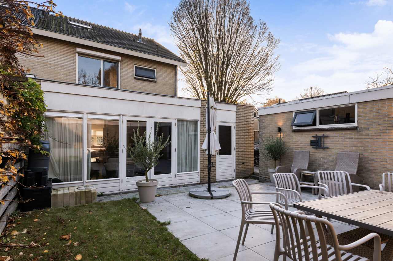 Buiten: De tuin is te bereiken via de oprit aan de zijkant van de woning, met een eigen achterom. Dankzij de ligging op het noorden geniet je op elk moment van de zon. De ruime garage biedt plek voor je auto, fietsen, werkbank of tuinspullen.