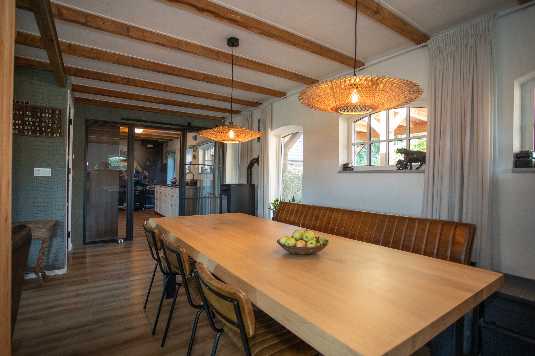 De vernieuwde voortuin met pergola vormt een prachtig entree. Binnen beschikt dit gedeelte over een hal met toilet, twee slaapkamers met kastruimte en een badkamer. De voormalige schuur is omgetoverd tot een sfeervol atelier met pelletkachel, eigen keuken en aansluitingen voor was- en droogmachine. De ruime woonkamer met nieuwe keuken is voorzien van vloerverwarming en pelletkachel. Vanuit hier bereikt u de fraai aangelegde tuin met overkapping en extra schuur (bakkershuisje).